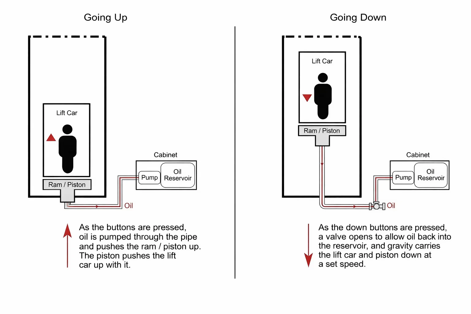 A home hydraulic lift operates using a fluid-powered pump and piston system where an electric motor dries oil from reservoir into a cylinder, pushing a piston upward to lift the cab. As the motor turns on the pump, moving oil into the cylinder raises the elevator cabin. For descending, the pump stops and the valve opens, allowing the weight of the cabin to push the oil back into the reservoir.