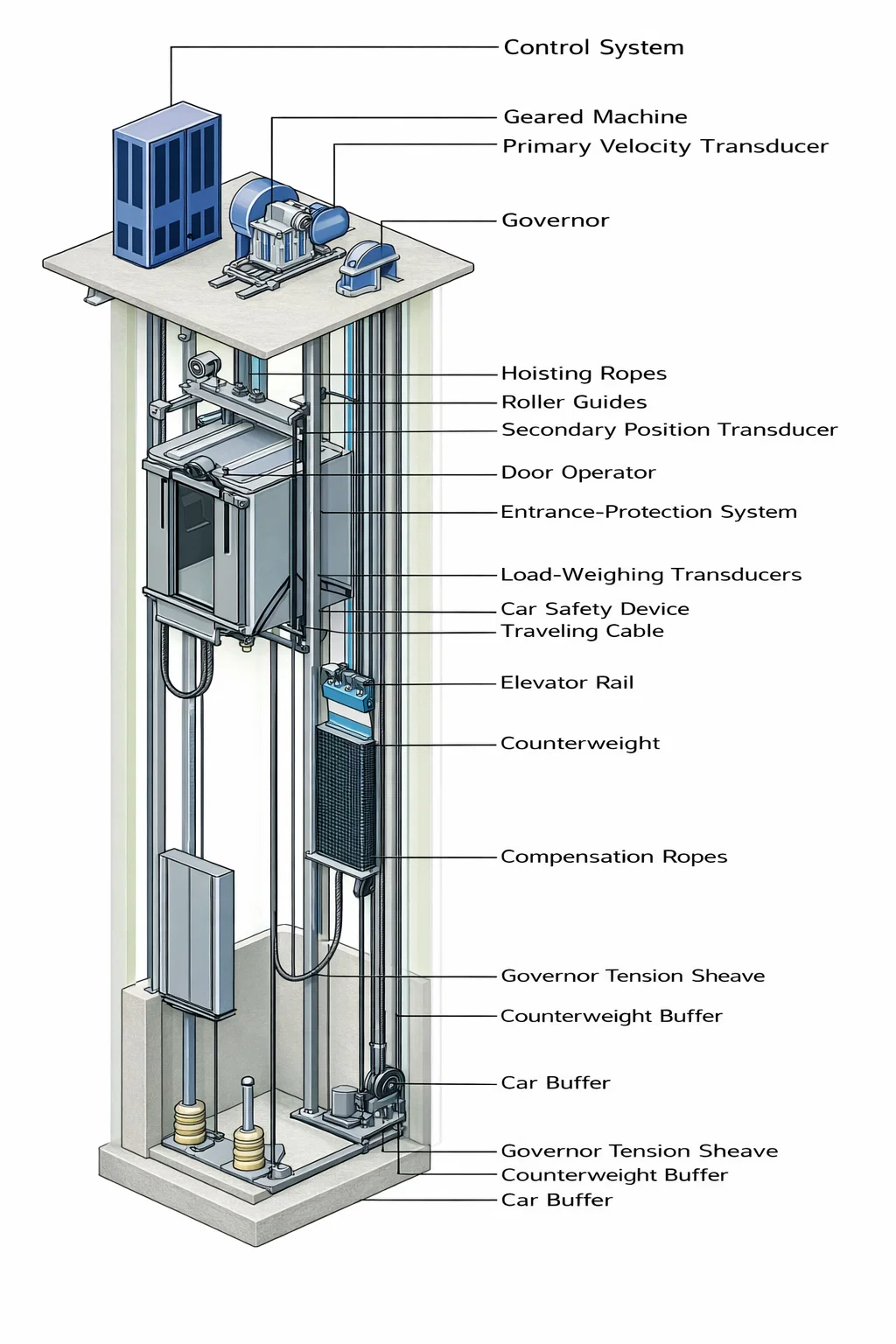 Traction lifts are efficient vertical transportation system using counterweight with steel ropes or belts and a sheave. Under this system, there are generally two types of traction lift namely – gearless traction elevator and geared traction elevator.